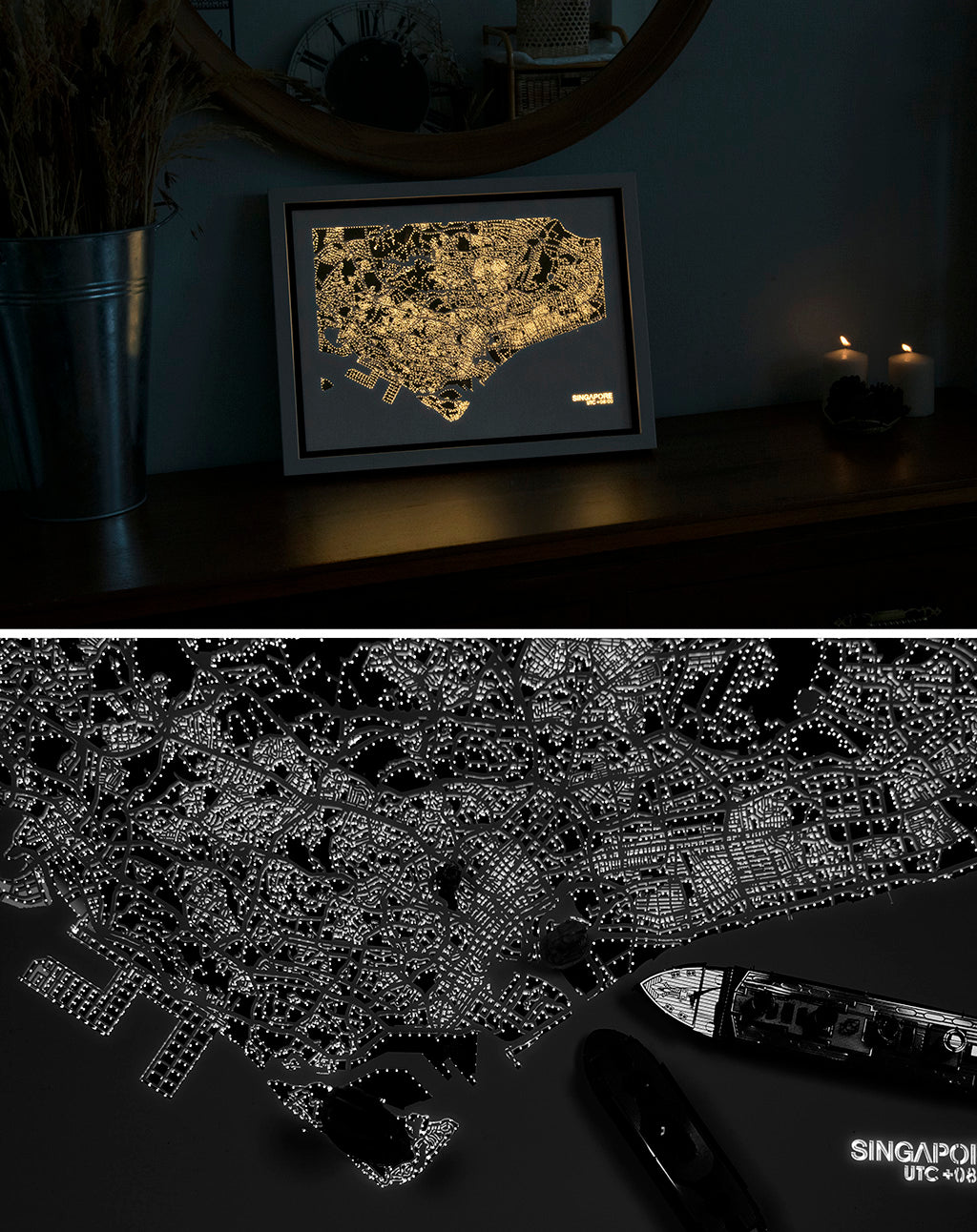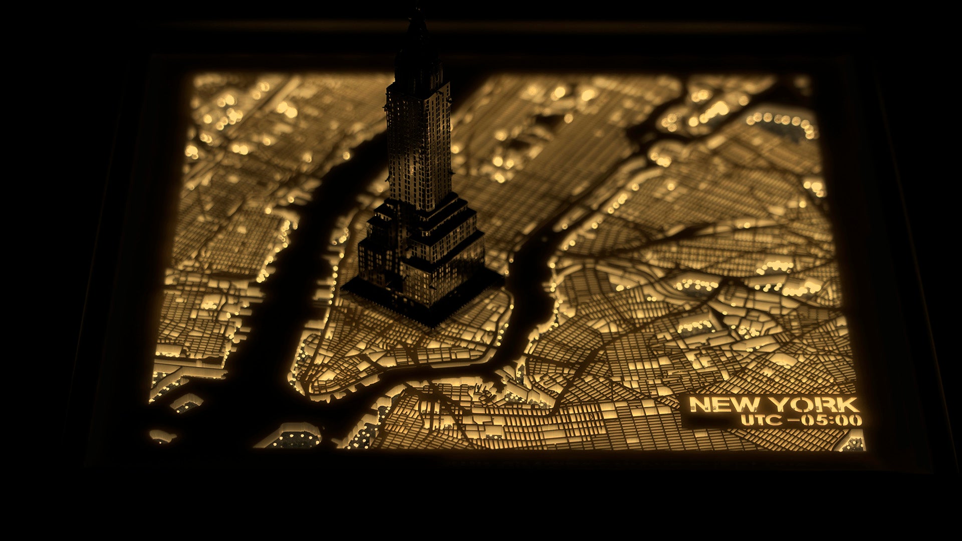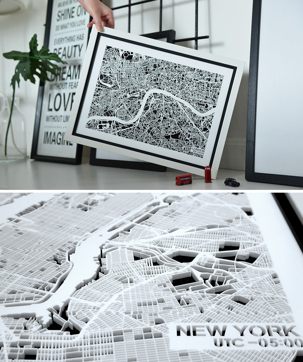 Each artwork of the city map is crafted with precise clean cut and contours with micro details (some lines as thin as 0.6 mm). We remain all the actual map accuracy (OpenStreetMap data), and restyle the streets, roads and rivers in the form of 3D ART. Our Satin-White finishing of the city street layer resemble a minimal purity of white canvas painting. Each city map is accompanied by the city’s name with its respective time zone (UTC).