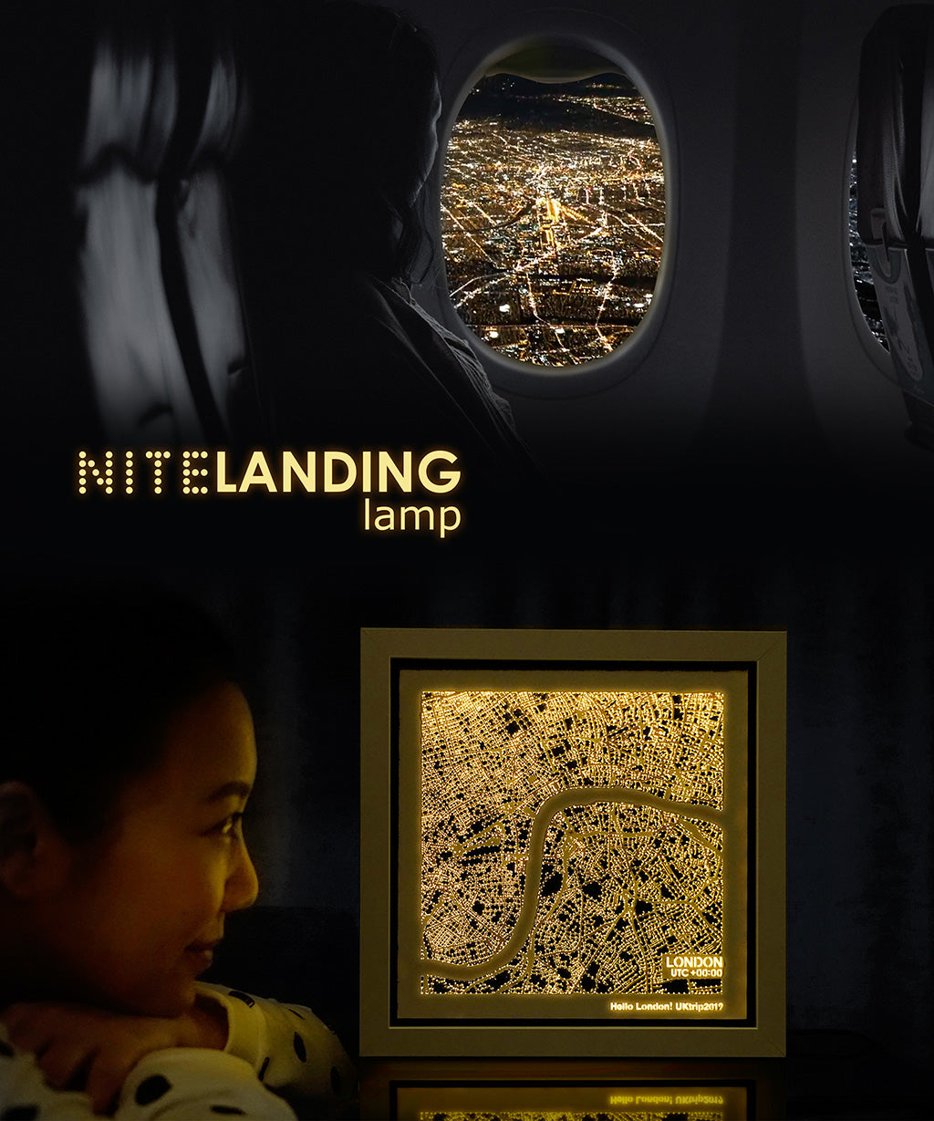 NITELANDING™ is an evocative lamp, crafted to bring back the moment of looking down at a bustling metropolis city view from your window airplane seat at 30,000 ft in the air.