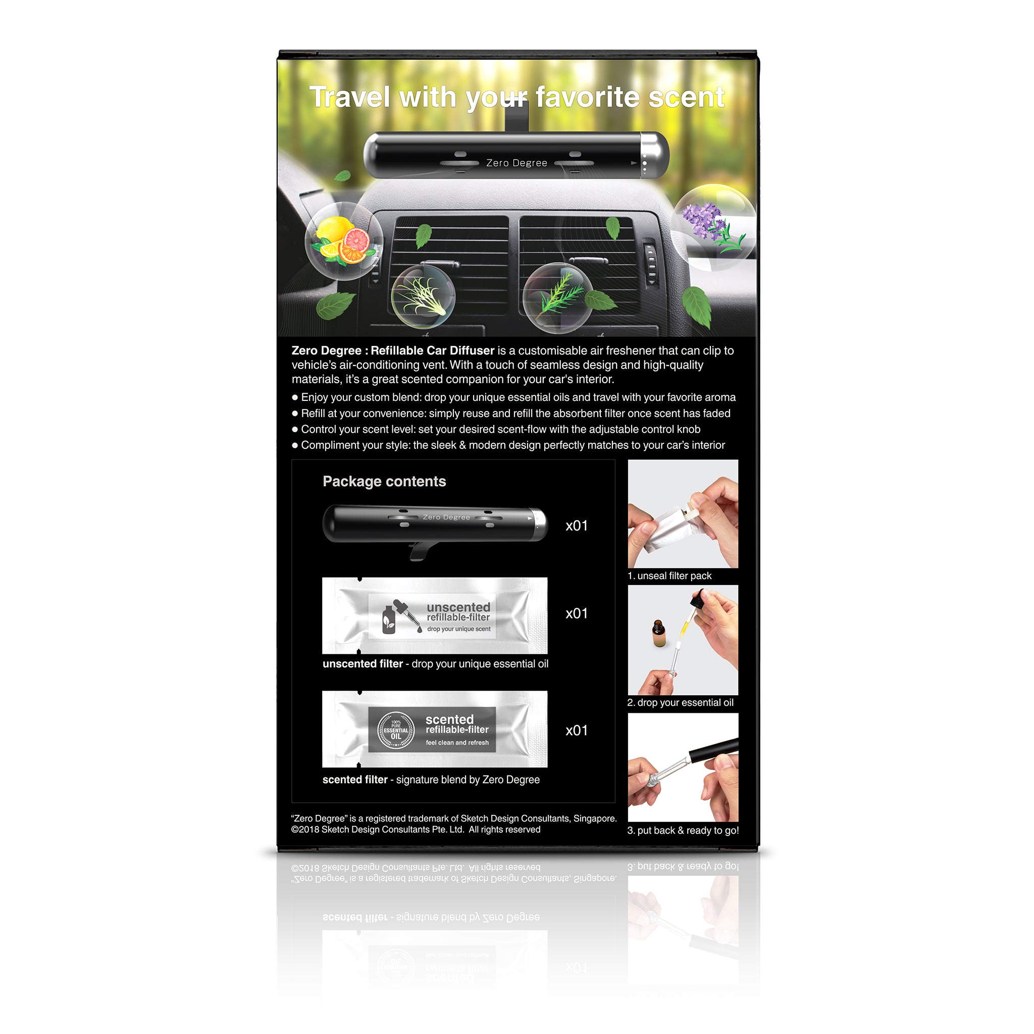 Zero Degree : Refillable Car Diffuser is a customisable air freshener that can clip to vehicle’s air-conditioning vent. With a touch of seamless design and high-quality materials, it’s a great scented companion for your car's interior.